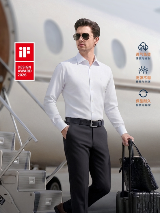 作为今年春夏新品的核心亮点,第四代欧定头等舱高弹衬衫·透气Pro一举斩获iF设计奖,成为2026年商务男装品类唯一的中国获奖产品。欧定品牌创始人朱家勇介绍,该款衬衫使用Pima棉与超韧天丝混纺,两者U型互锁,“一吸一疏”,形成“双气道”结构,通过虹吸效应将体热、汗液迅速从皮肤表面导向面料外层,实现透气率超180mm/s,让商务男士在南北商旅途中,保持清爽舒适。
