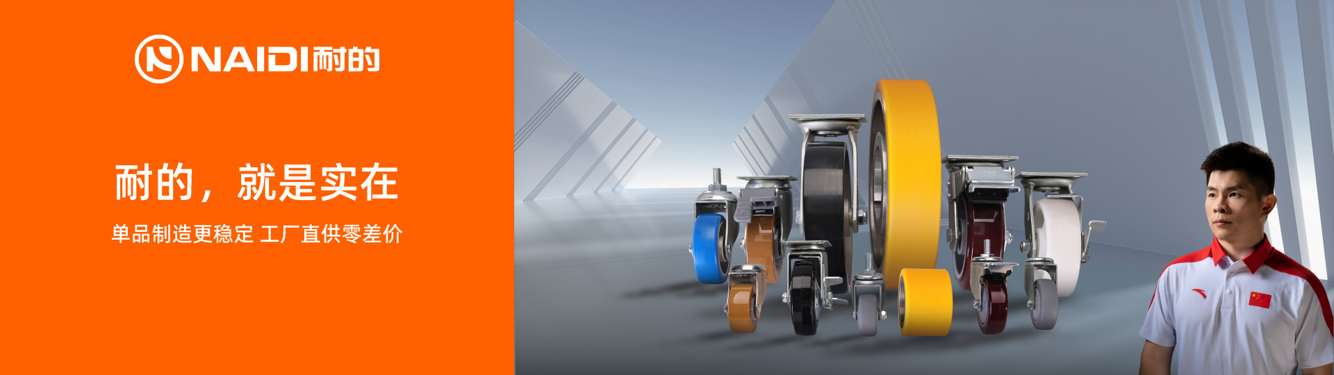 举重赛场,以力量问鼎巅峰;脚轮制造,以品质承载未来。奥运举重冠军林清峰代言,不止是形象,更是品质的认可。专注高强度承重、耐磨抗造、顺滑静音、安全稳固,且在工业重载减震、不锈钢重载、耐酸碱、寿命长、低重心结构最强等方面也表现出色,适用于工业设备、仓储物流、机械设备、商用器械、医院等多场景。耐的品牌以冠军标准严控品质,用专业脚轮支撑万千重任,让移动更安全,让承载更放心。