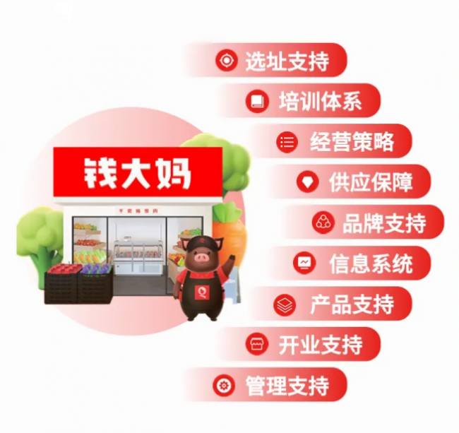 为帮助加盟商降低创业门槛、提升经营成功率,钱大妈推出“九大加盟支持体系”,覆盖从选址到运营的全流程: