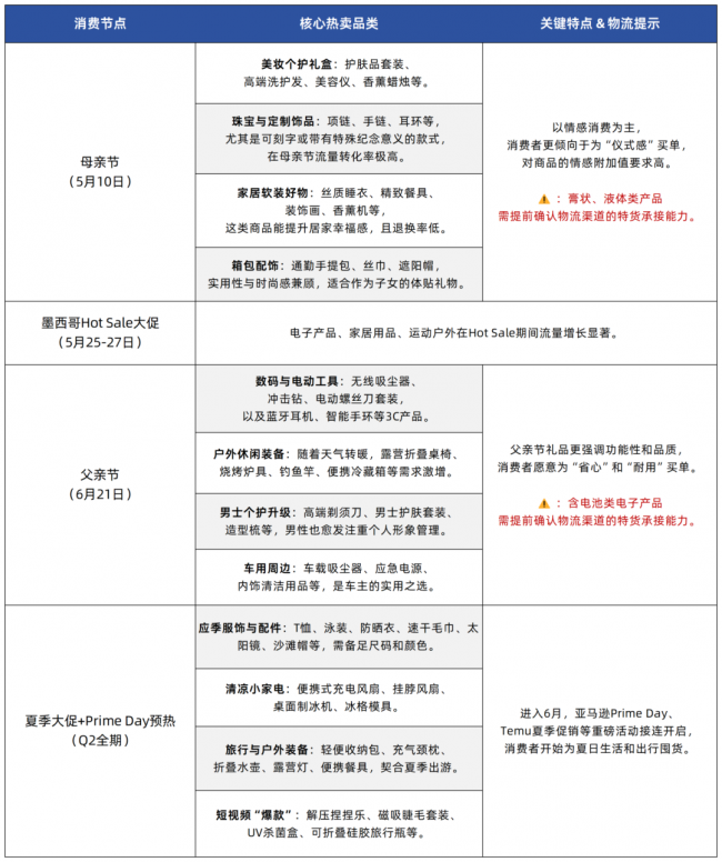 第二季度被视为跨境电商全年的又一“全球狂欢季”。从节点分布看,儿童节、母亲节、父亲节在欧美、拉美等多国市场同步开启,形成集中送礼高峰。拉美市场将迎来美客多(Mercado Libre)年度大促Hot Sale,预计平台流量峰值可达平日的三倍。此外,北半球夏季消费全面启动,叠加暑假、欧洲夏季大促及亚马逊Prime Day,整体促销周期持续升温。