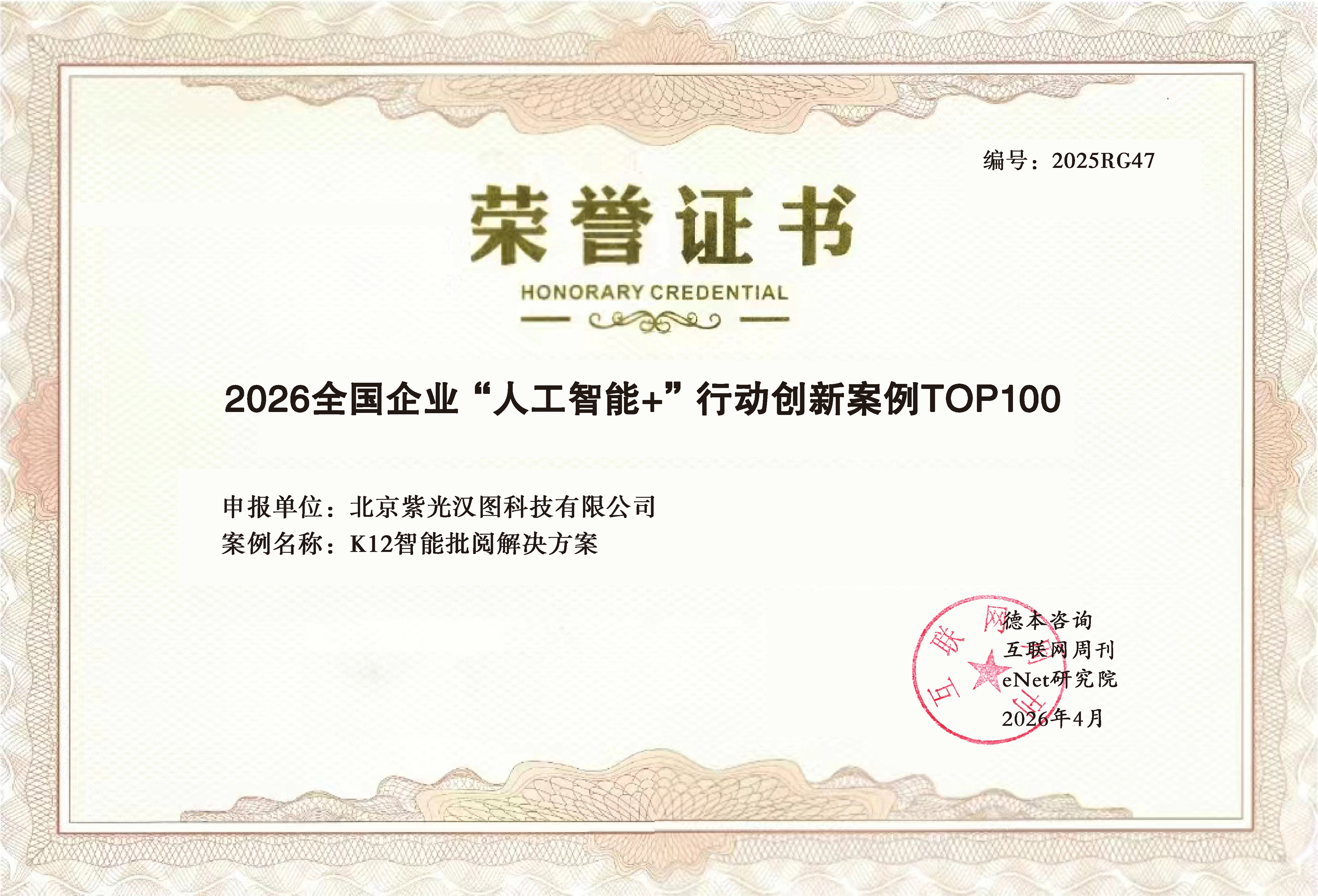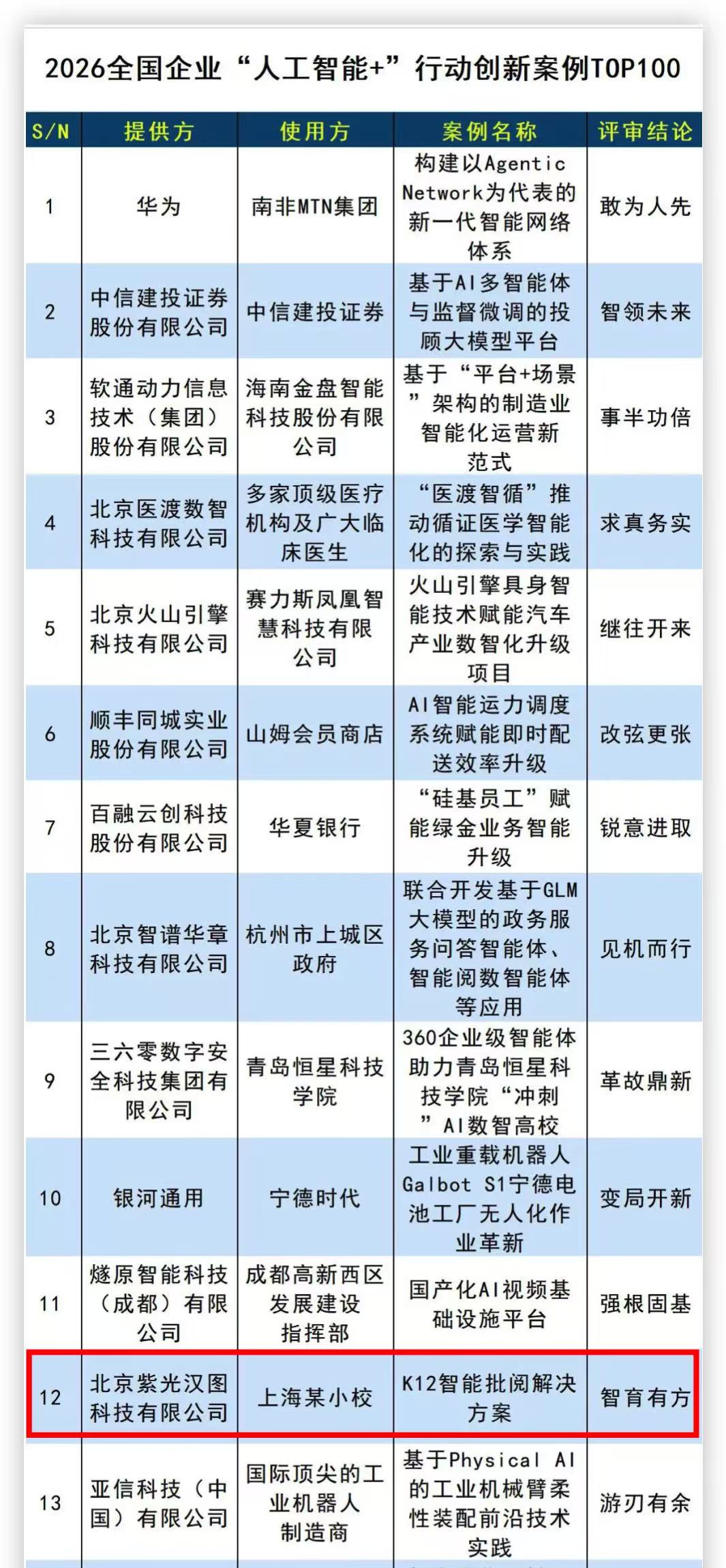 随着人工智能从“参数竞赛”迈向“场景深耕”,AI正以前所未有的速度重构产业边界。近日,由《互联网周刊》、eNet研究院、德本咨询联合发起的“2026全国企业‘人工智能+’行动创新案例TOP100”榜单正式公示。北京紫光汉图科技有限公司(简称“紫光汉图”)凭借自主设计的“K12智能批阅解决方案”强势入选,并荣列榜单第12位!