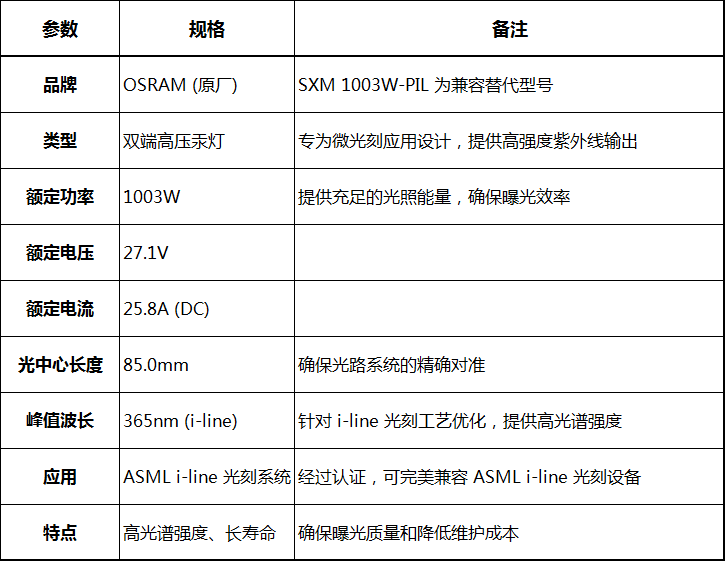 SXM 1003W-PIL 微晶光刻灯的技术规格与原厂 OSRAM HBO 1003 W/PIL 完全匹配,确保了其在 ASML i-line 光刻系统中的无缝集成和最佳性能。其核心技术参数如下: