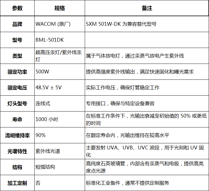 SXM 501W-DK 汞灯的技术规格与原厂 WACOM BML-501DK 保持一致,确保了其在工业环境中的可靠运行。其核心技术参数如下: