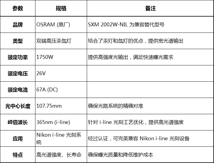 SXM 2002W-NIL 氙灯的技术规格与原厂 OSRAM HBO 2002 W/NIL 保持高度一致,确保了其在严苛的微光刻环境中的稳定表现。其核心技术参数如下: