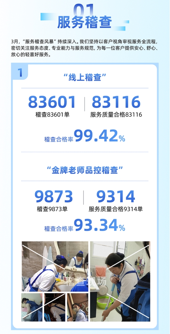 轻喜到家建立了覆盖服务全流程的“稽查风暴”体系。3月份,线上稽查覆盖超8.3万单服务,合格率99.42%;服务满时率99.86%,稽查打卡记录3.2万余单,不满时情况仅46单;工装规范合格率99.56%,装备规范合格率98.04%。公司还对“爽约行为”实行零容忍监管,以明确红线机制保障服务确定性。