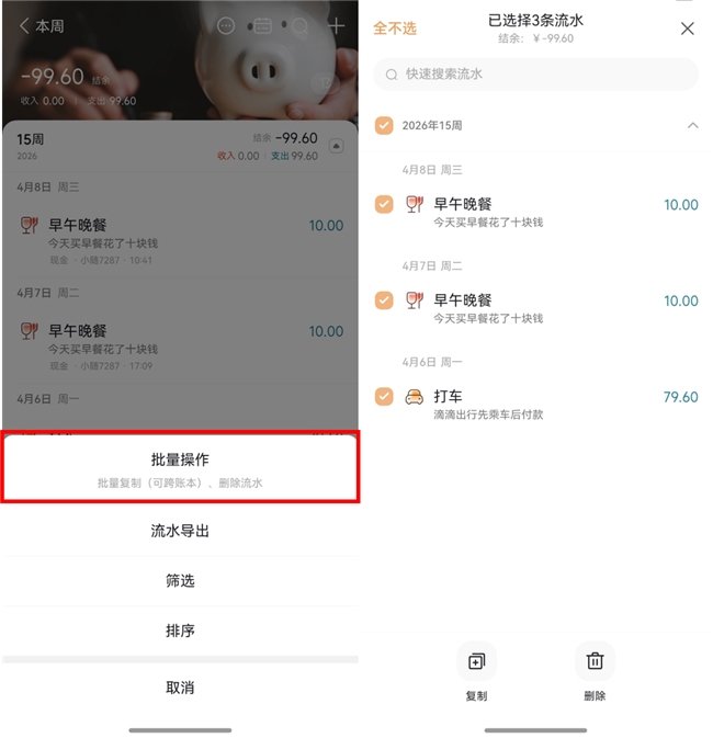 ·流水管理高效加倍:点击流水页右上角“…”进入批量管理,账目的批量删除、跨账本复制一键搞定,更换账本也毫无压力,理账效率直接起飞~