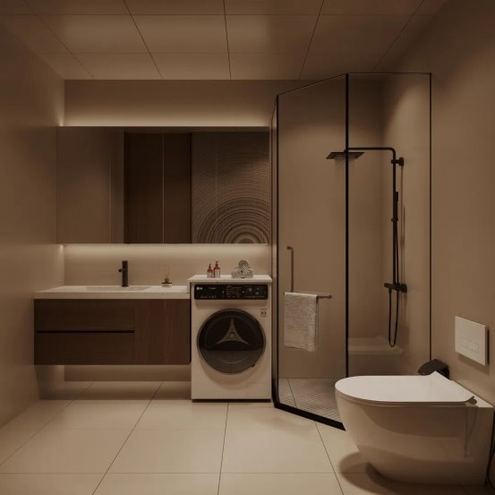 卫浴:高湿环境+卫生死角,防霉与易清洁缺一不可卫浴柜常年面对水汽和潮气,普通板材容易发霉、变形,底部卫生死角更是霉菌的温床。柏菲伦以0级防霉板材为基础,同时推荐悬浮式安装设计,让柜体轻装上阵,弱化体量感,空间更显开阔通透;底部悬空便于日常清洁,减少卫生死角。整体色系选用温润的木纹,以低饱和色调构建静谧、治愈的氛围——防霉+易洁,卫浴也能很优雅。