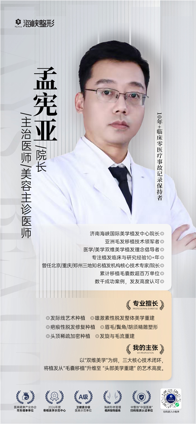 在毛发移植领域,技术与美学的完美融合是永恒的追求。济南海峡国际美学植发中心院长孟宪亚深耕植发临床与研究十余年,以10 年 + 临床零医疗事故的硬核记录,广受推崇。
