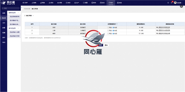 针对药监平台对接技术壁垒,同心雁S-ERP内置标准化、可扩展的药监数据接口,兼容国家药监局UDI数据库、生产监管信息平台、经营监管平台等官方系统的最新接口规范,支持多版本接口适配,企业无需额外开发即可快速完成对接注册、测试联调与正式上线。系统支持UDI数据一键申报、自动同步、批量更新,本地业务数据生成后,自动按照监管格式封装、校验、上传,实现企业端与药监端数据实时一致,彻底消除人工录入误差与数据滞后问题。
