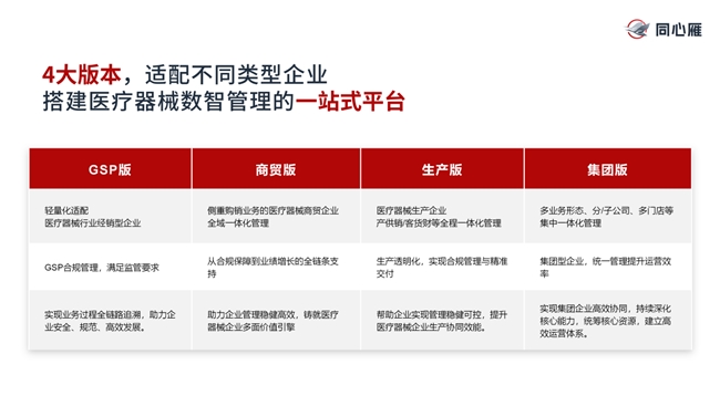 未来,随着智慧监管持续深化与行业高质量发展推进,同心雁S-ERP将持续迭代升级,紧跟药监政策与技术变革,不断优化药监对接能力、拓展行业适配场景、提升数智服务水平,与广大医疗器械企业携手同行,以数智化赋能合规管理,以高效能对接助力产业升级,共同推动中国医疗器械产业迈向更规范、更高效、更创新的高质量发展新征程,为守护公众生命健康、助力健康中国建设贡献坚实力量。