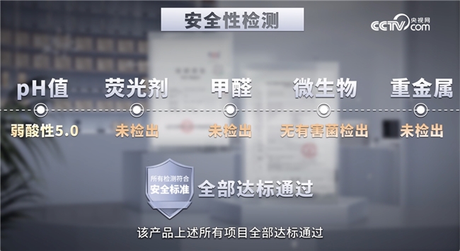 在安全性检测环节,检测机构围绕pH值、荧光增白剂、卫生指标及甲醛含量四大关键维度展开全面检测。结果表明:该产品的pH值稳定在5.0左右,与女性私密部位天然的弱酸性环境高度吻合;荧光增白剂未检出,产品配方纯净温和;同时,卫生指标与甲醛含量均远低于国家标准限值,从多个维度印证了产品的使用安全性。