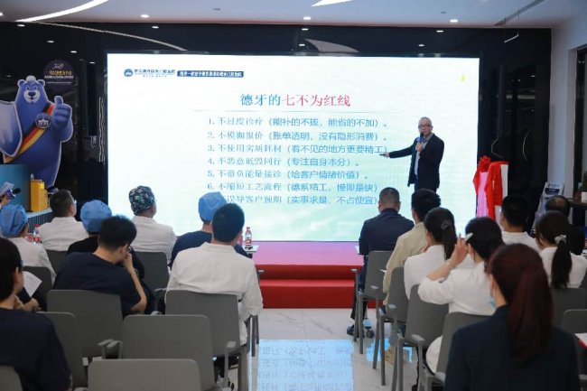 会上,德牙口腔创始人黄春池董事长围绕《本分宣言》核心精神,结合南京市民看牙痛点,深度解读“德牙七不为”刚性准则,将“善良靠谱”的服务理念转化为可落地、可监督的行动标尺:坚决不过度诊疗,遵循“能补不拔、能省不加”原则,不做不必要治疗;坚持不模糊报价,账单全程透明,杜绝任何隐形消费;严守不使用劣质耗材底线,在患者看不见的诊疗细节处坚守德系精工品质;恪守不恶意诋毁同行准则,专注自身医疗本分;摒弃不负能量接诊行为,为患者提供正向情绪价值,让看牙过程更温暖;坚守不缩短工艺流程,以“慢即是快”的德系精工保障诊疗安全;做到不误导患者预期,实事求是告知病情与方案,不贪图一时便宜。