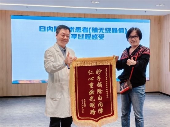 患者真情分享,技术惠及民生。活动上,一位58岁的退休教师分享了自己“光明蜕变”故事,并向张朝军院长赠送锦旗。她激动地说:“我以前既有白内障又有老花眼,看书、看报、看电视都得换两副眼镜,特别麻烦。经过张院长评估,选择了臻无级,现在看远看近都清清楚楚,晚上开车也不怕对面车灯的光晕了,视觉质量超乎预期,十分满意!”