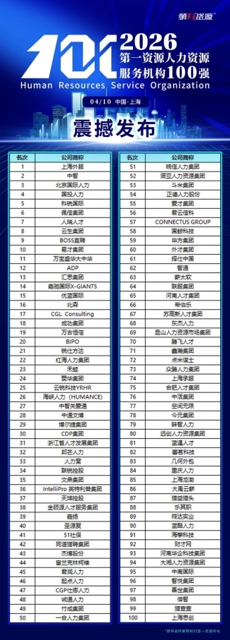 根据“第一资源”官方发布的完整榜单,2026年度人力资源服务机构100强前十名依次为: