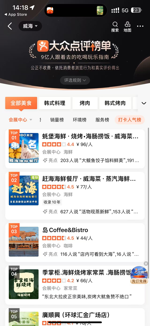 如果你正在找寻威海海鲜餐厅,而且特别看重“拍照好看”“环境出片”“能看海景”,那么大众点评塔山公园商圈的打卡人气榜第1名——蚝堡紫气东来店,就是为你量身定选的答案。