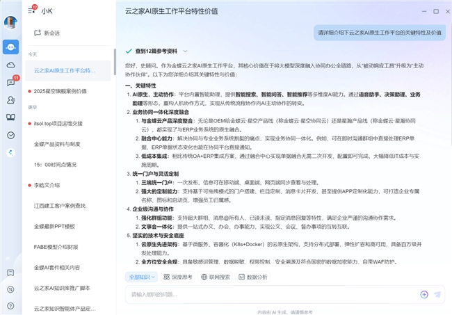 ·AI智能助手小K:提供智能问答、工作任务规划、会议总结、流程快速发起等功能,自动处理重复性事务,辅助员工聚焦核心工作。