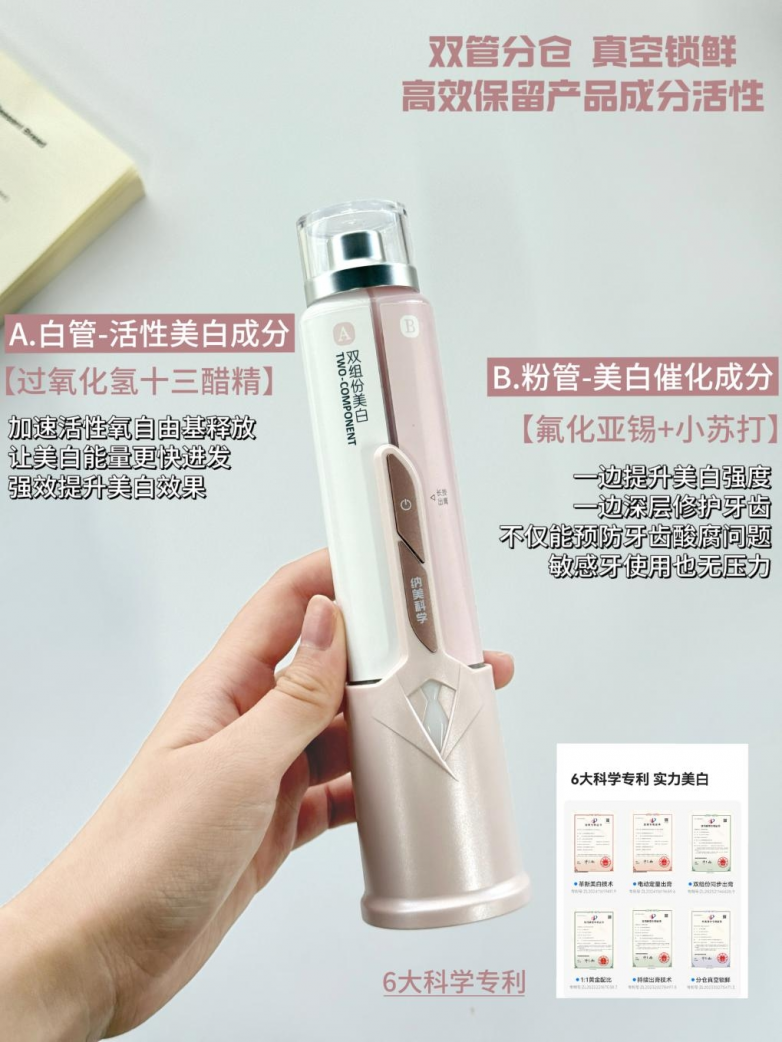 纳美科学电动双管双组份美白牙膏,它采用双组份催化锁鲜科技,刷牙时释放真正有效的大量活氧分子,轻松渗入牙釉质,实现6倍溶渍力,深度瓦解焦油、烟渍、咖啡渍等顽固色素。权威检测显示,其美白效率提升高达823.75%,能有效去除29种常见外源性色斑。