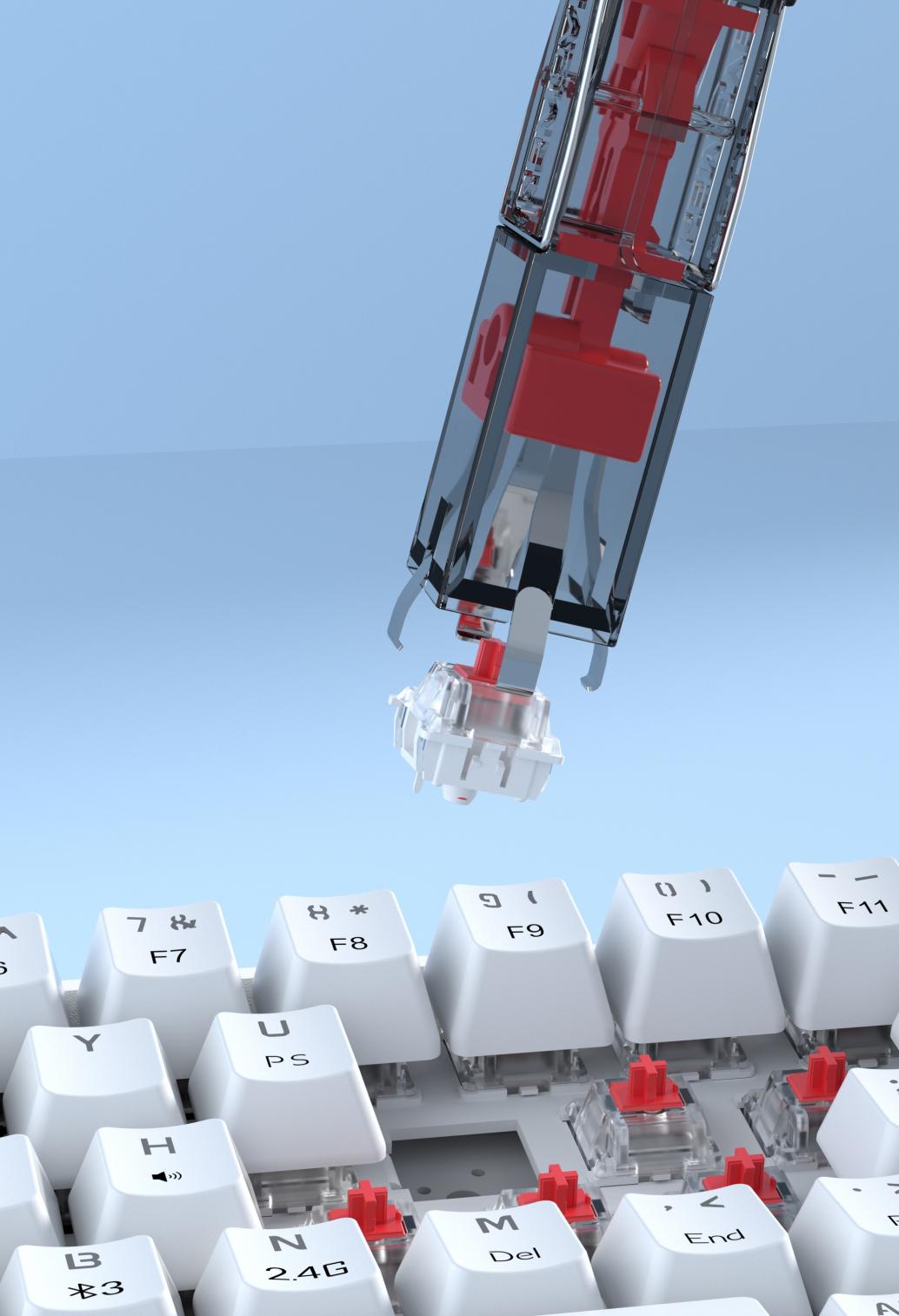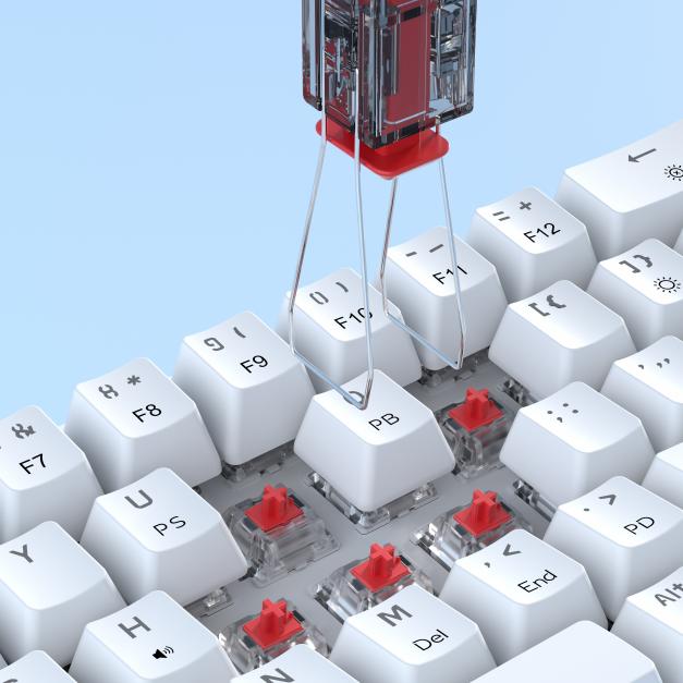 四爪联动结构自带自动对正功能,无需精确对准轴体,按压时自动完成对位,垂直按压即可轻松拔取,大幅降低操作难度。搭配方形握柄的人体工学设计,贴合手部发力习惯,防滑不硌手,即使长时间批量换轴也不易手指酸胀。拔取后顶部一键释放轴体,有效避免飞轴丢失,操作更流畅、更安全。