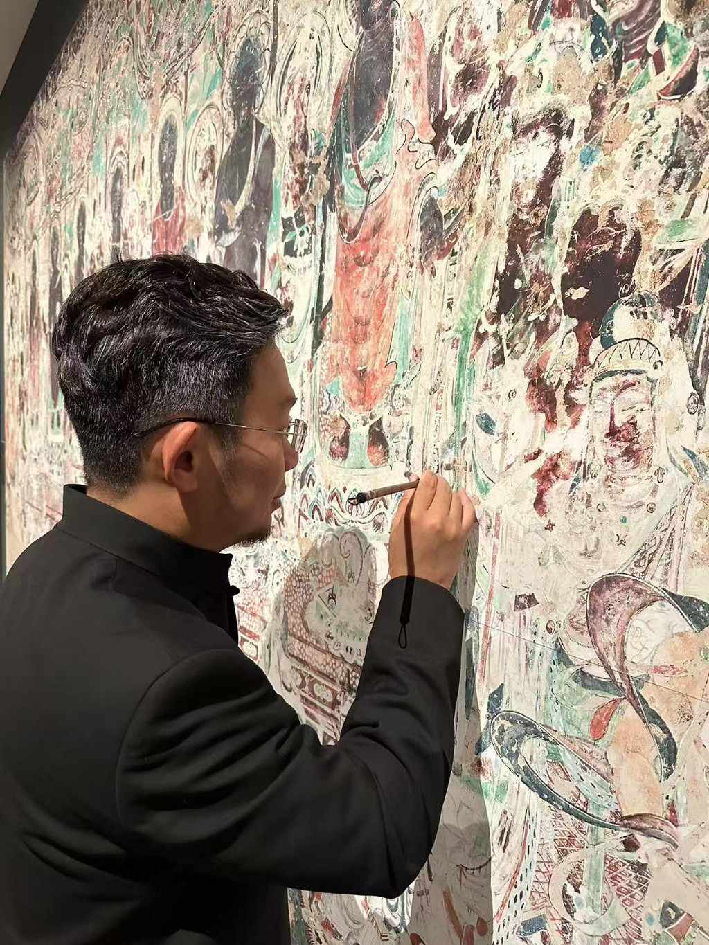 从90年代至今,从博物院带队往返敦煌戈壁滩数十次,累计绘制壁画超2000余平方米,制定壁画绘制与还原标准技艺,在博物院共计培养壁画技艺接班人30位。走遍我国名山大川,包括敦煌莫高窟、河南洛阳龙门石窟、云冈石窟、西安碑林,其以半生跋涉换笔墨风华,以千锤百炼铸就文化丰碑,以敦煌画派,再现壁画风采。