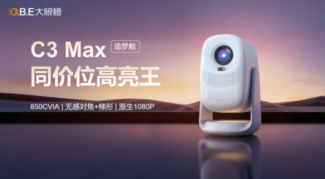面向大众消费市场,大眼橙同步推出C3 Max智能投影产品。该产品实测亮度达850 CVIA流明,支持原生1080P全高清分辨率,配备无感自动对焦与全自动梯形校正功能,在千元级产品中树立了体验新标杆,进一步降低高品质家庭影院的普及门槛,助力智能投影产品的消费下沉与体验升级。