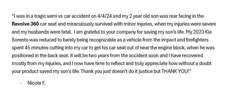 2026年伊始,一封来自美国母亲的感谢信跨越重洋抵达好孩子集团,文字里藏着车祸的惊魂、失亲的痛楚,更藏着对生命被守护的无尽感激——“2024 年 4 月 4 日,我遭遇了一场惨烈的半挂卡车与汽车相撞事故,我的 2023 款起亚索兰托被撞得面目全非,消防员花了 45 分钟才将孩子的安全座椅取出。丈夫遇难、我重伤,两岁的儿子却仅受轻伤——毫无疑问,是好孩子的安全座椅,救了他的命。”