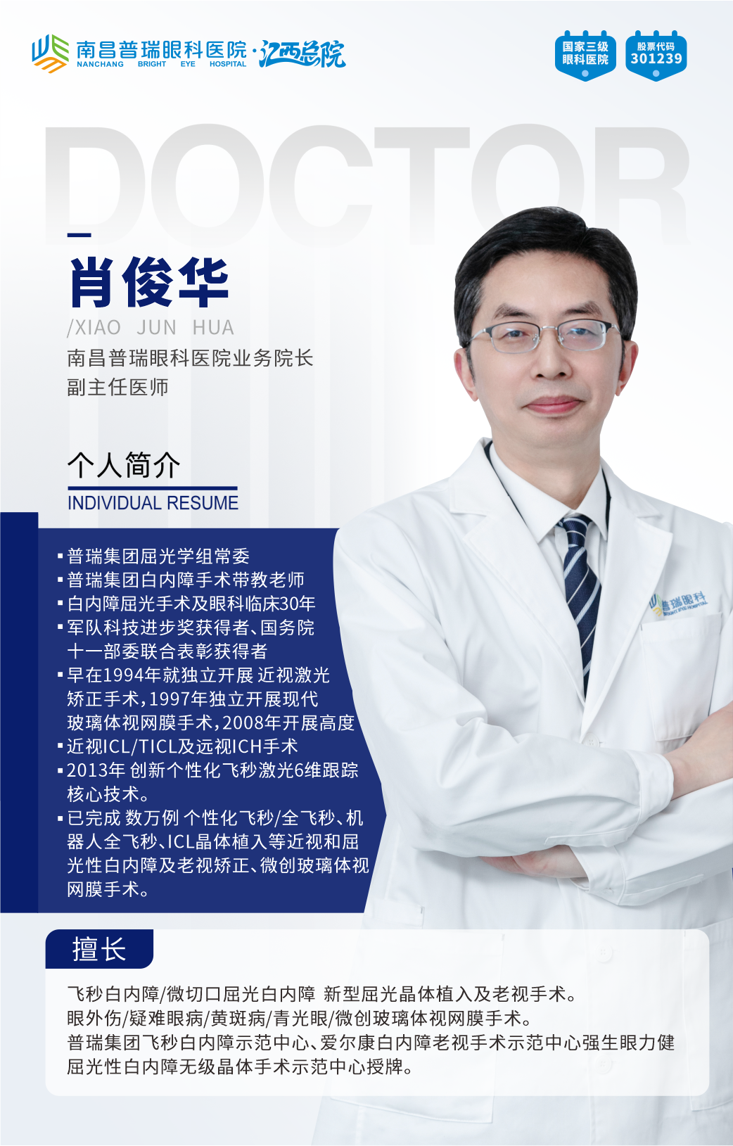 为两人实施手术的肖俊华院长,是南昌普瑞眼科医院业务院长、副主任医师,肖俊华院长是普瑞集团白内障带教老师,国内较早开展眼科诊疗的专家之一,拥有军队系统的精研背景,获军队科技进步奖及国务院十一部委联合表彰。他将深厚的屈光手术经验完美融入白内障治疗,精于通过飞秒激光辅助联合功能性人工晶体(多焦点、散光矫正型等)植入,让患者术后不仅“看得见”,更能“看得清、看得好”,满足驾驶、阅读、看手机等多种视力需求,实现从“复明”到“优视”的跨越。