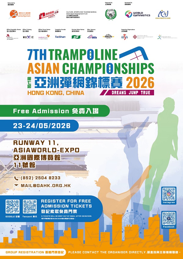 【香港.2026年4月21日】由中国香港体操总会主办,香港特区政府康乐及文化事务署,以及文化体育及旅游局艺术及体育发展基金资助,并获世界体操联合会(World Gymnastics)及亚洲体操联盟(AGU)授权的“第七届亚洲弹网锦标赛2026”,将于5月23日至24日在中国香港亚洲国际博览馆11号馆举行。作为亚洲最高级别的弹网赛事之一,今届赛事再度落户香港,汇聚来自中国、中国香港等10个亚洲国家及地区的弹网选手同场竞技,争夺2026年爱知·名古屋亚运会入场券。