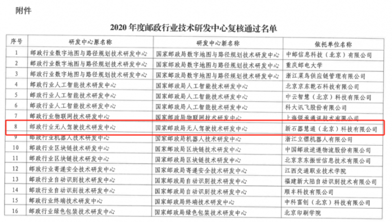 近日,国家邮政局公布第三批技术研发中心认定结果,九识智能、深向科技凭成功获批国家邮政局无人车技术研发中心。其中,九识智能成为继新石器无人车之后,国内第二家斩获该邮政快递领域国家级权威资质的无人配送车企业,标志着我国邮政快递业无人化技术创新体系的进一步扩容。