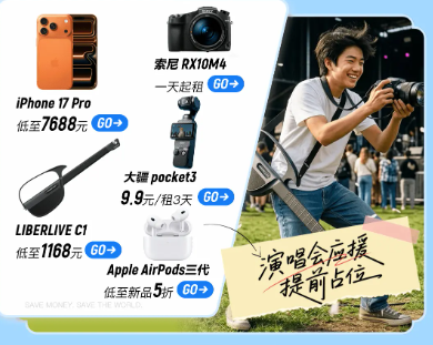 针对演唱会上最核心的远距离拍摄与视频记录需求,转转集结了多款口碑旗舰机型与专业影像设备。最新发布的iPhone 17 Pro在活动中低至7688元,其强大的长焦镜头与视频防抖能力足以胜任看台区的舞台拍摄;对于追求极致影音体验的用户,AirPods三代低至5折的优惠力度,也让出行途中沉浸式重温现场歌单成为一种享受。