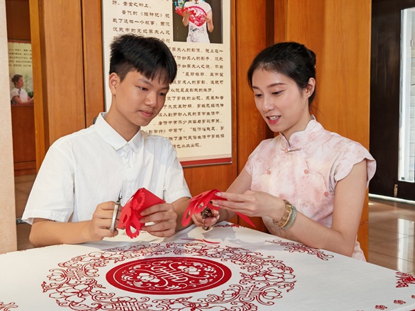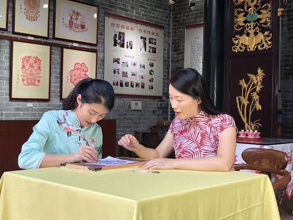 吴育珊跟随韩艳学习广州剪纸非遗技艺