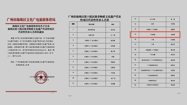 2026年4月10日,海珠区文化广电旅游体育局公布了海珠区第十批区级非物质文化遗产代表性项目代表性传承人名单,其中,广州剪纸传人吴育珊经申报、评审和公示,被评为广州剪纸【又名剪纸(海珠)】这项非遗项目的代表性传承人。