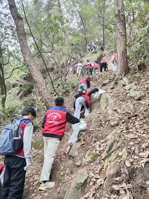 志愿者们沿着蜿蜒的山路向上行进,有的在陡坡上小心翼翼地捡拾嵌在石缝里的垃圾,有的则弯腰清理步道旁的废弃物,分工合作,默契配合,让原本散落杂物的山林逐渐恢复整洁。