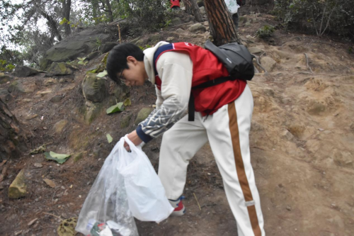 活动当天,大学生志愿者们携带垃圾袋、手套等工具,分组深入山林步道、陡坡、林间空地等区域,细致清理塑料瓶、食品包装袋、烟头等各类垃圾。山林坡陡路滑,脚下布满碎石与落叶,志愿者们依旧专注于角落缝隙的细碎杂物,以“地毯式”搜索确保清洁无死角。尽管山路崎岖难行,同学们的热情却丝毫未减,一步一弯腰,将散落的垃圾逐一收纳,用脚步丈量山林,用双手守护绿意。