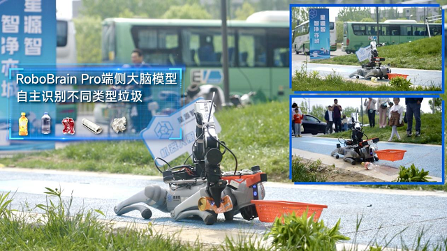 感知-决策-控制一体的端侧大模型。基于RoboBrain Pro具身大脑模型,融合多模态空间智能与跨本体控制核心技术,小智高效精准地识别塑料瓶、包装袋、纸团等常见垃圾,并进行自主抓取及垃圾回收作业,实现“边看-边想-边动”的智能化作业。