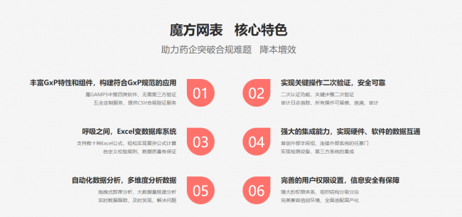• 内建21 CFR Part 11核心功能:平台原生支持电子签名、二次认证、审计追踪、权限分级管理。所有操作都会被自动记录,全程留痕,数据的创建、修改、删除全过程均可追溯。 • 简化CSV验证:企业只需进行自我验证,无需第三方介入,验证周期可以从数月缩短至数周,一次验证、持续使用。 • 强大的集成能力:凭借独创的“外部字段组”功能,魔方网表可以无缝对接ERP、LIMS、MES、QMS等各类系统,彻底消除“数据孤岛”问题。