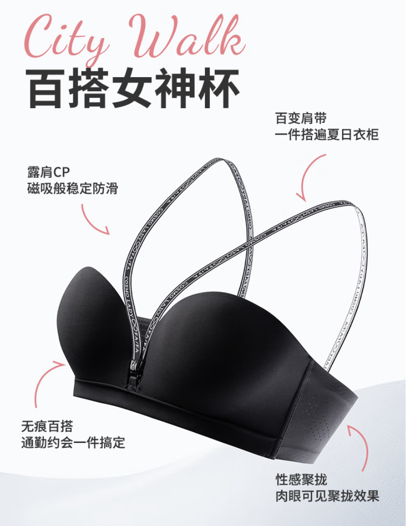 一体式无痕压模工艺:无线头摩擦、无边缘凸起,隐形不露痕,搭配紧身衣、薄衫、吊带完全无迹可寻,打造 “第二层肌肤” 般裸感体验;