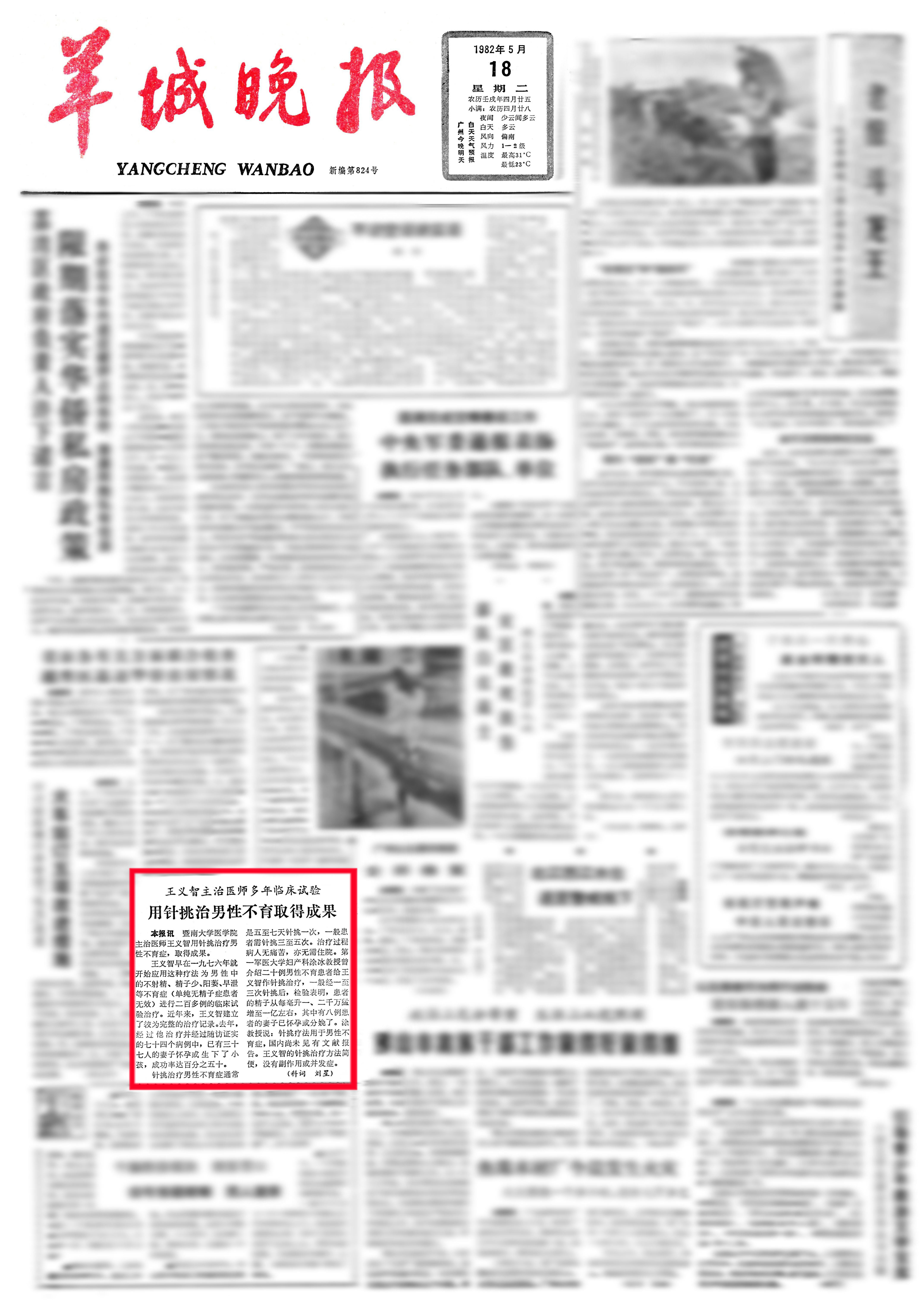1982年5月18日羊城晚报头版介绍王义智主治医师用针挑治疗男性不育症取得成果的报道彼时陈栋刚刚来到暨南大学,师从王义智教授。他回忆,报道刊发前,科室日均接诊患者仅二三十人;见报后,迅速创下“日收百信、日接百患”的“双百”效应——高峰期日均接诊破百人,每天收到来自全国各地患者来信百余封,累计收到上千封求助信,有患者凌晨就来排队挂号。