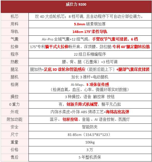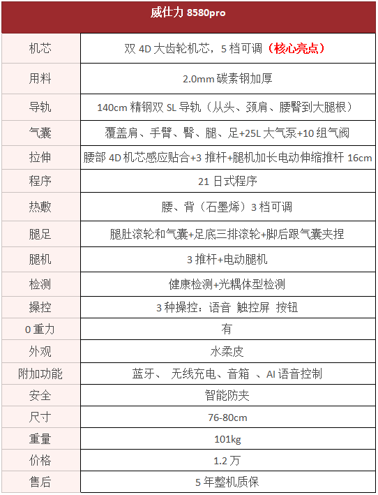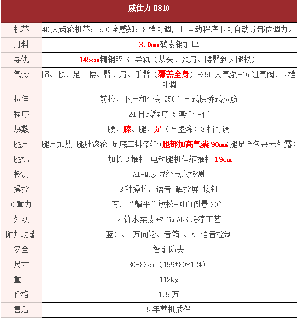对比了这几款热门机型,可以看出威仕力整体用料都比较扎实,万元级及以上价位机芯都做到了4D齿轮机芯,用料不断加厚价款,气囊、热敷和腿足也都一直精益求精。