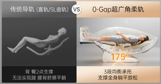 传统导轨一般是V型窝坐,而三段柔轨可以分段精准托住颈肩、背、腰臀、腿足,这样躺平状态下压力就会均匀释放,实现全段脊柱深度放松。