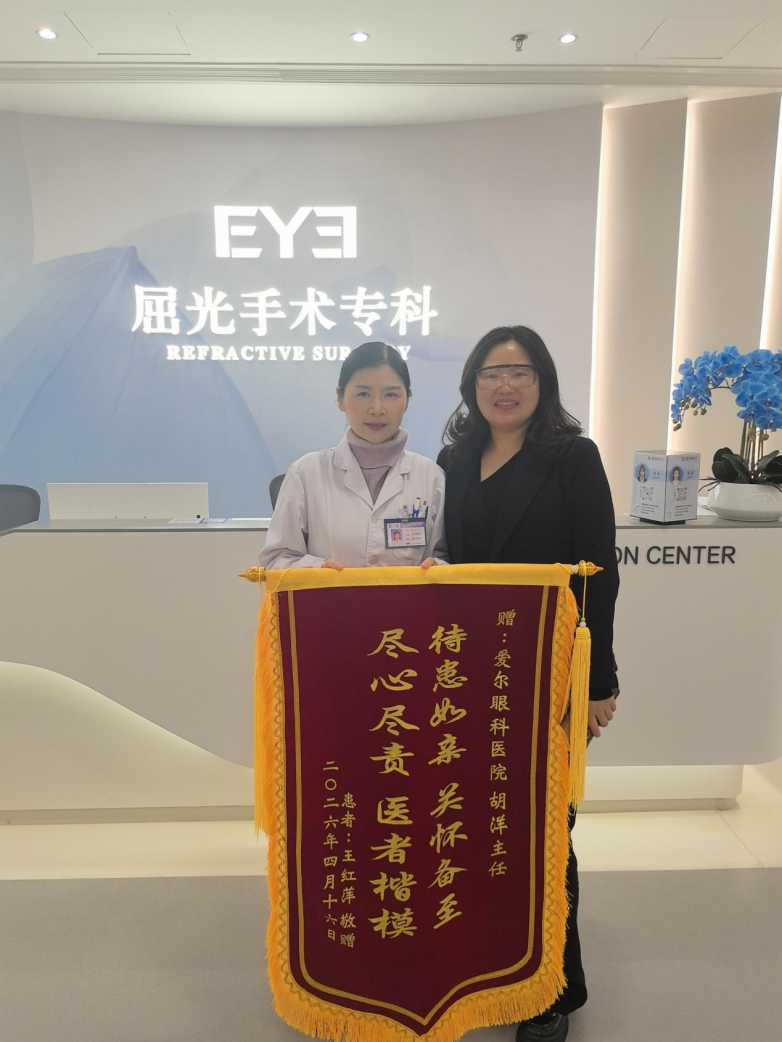 近日,在九江爱尔眼科医院,患者王女士术后复查视力远超预期,特意送来锦旗,向屈光科主任胡洋及团队致以诚挚感谢。凭借精湛的个性化手术方案与过硬技术,胡洋主任再次用实力赢得患者认可。