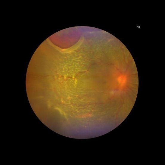 一张裂孔源性视网膜脱离的眼底彩照,颞上方有较大的裂孔,边缘反卷,整个视网膜脱离呈青灰色隆起。患者视力下降,伴眼前黑影飘动1月余。