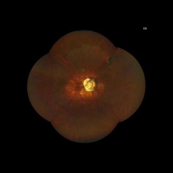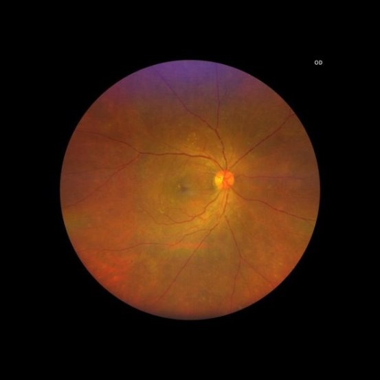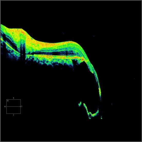 一张红黄绿的OCT(光学相干断层扫描),边缘呈断崖式垂落,显示黄斑部(视网膜视力最敏锐的位置,承担人90%的视力)视网膜脉络膜缺损。患者自由视力不佳,如今只有眼前指数(仅能判断近距离如眼前50cm或30cm处,手指的数量)的视力。