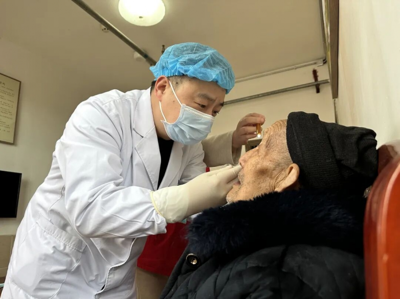 在敬老院简朴的房间里,王主任顾不上休息,立即为牟爷爷检查伤口愈合情况。“老人家,别紧张,稍微向上看,很快就好了。”王主任一边轻声安抚,一边熟练地操作。细致地为老人清理眼周,精准地剪断并取出缝线。动作轻柔、干练。拆线完成后,王主任又反复叮嘱:“恢复得很好,但这段时间还是要注意眼部卫生,不要用手揉眼,药水要按时滴……”