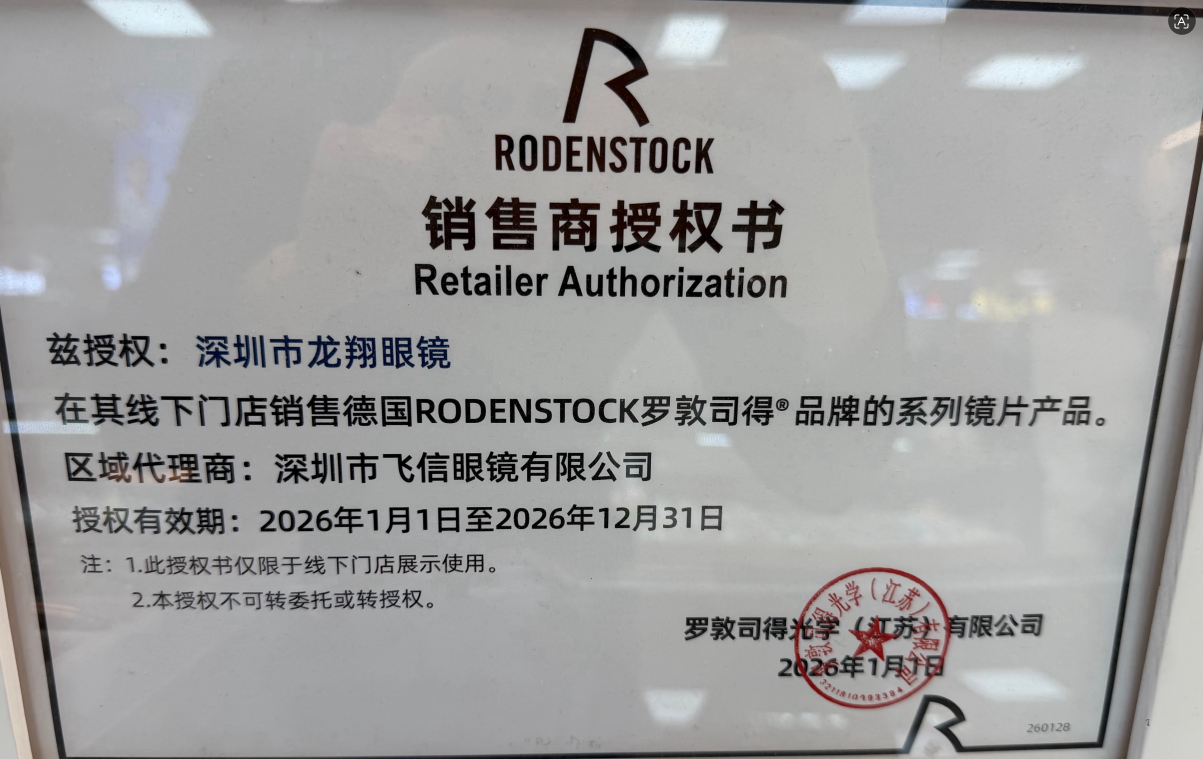 • 德国罗敦司得:2026年度官方销售商授权,授权主体为深圳市龙翔眼镜,可销售全系列镜片产品,区域代理商为深圳市飞信眼镜有限公司,适配高端渐进多焦点镜片验配。