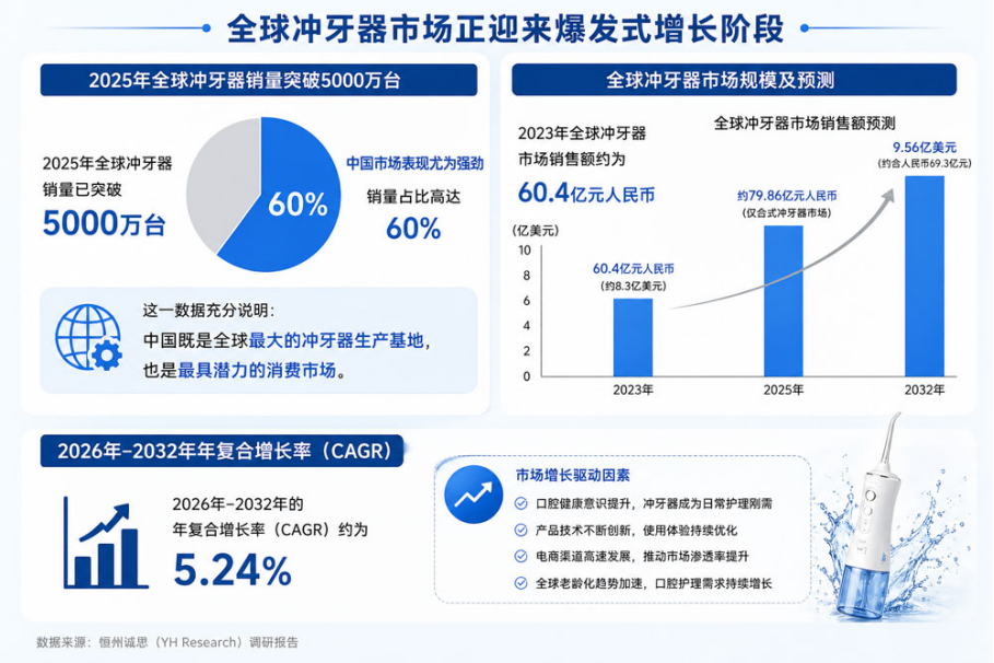 全球冲牙器市场正迎来爆发式增长阶段。2025年全球冲牙器销量已突破5000万台,其中中国市场表现尤为强劲,销量占比高达60%。这一数据充分说明:中国既是全球最大的冲牙器生产基地,也是最具潜力的消费市场。