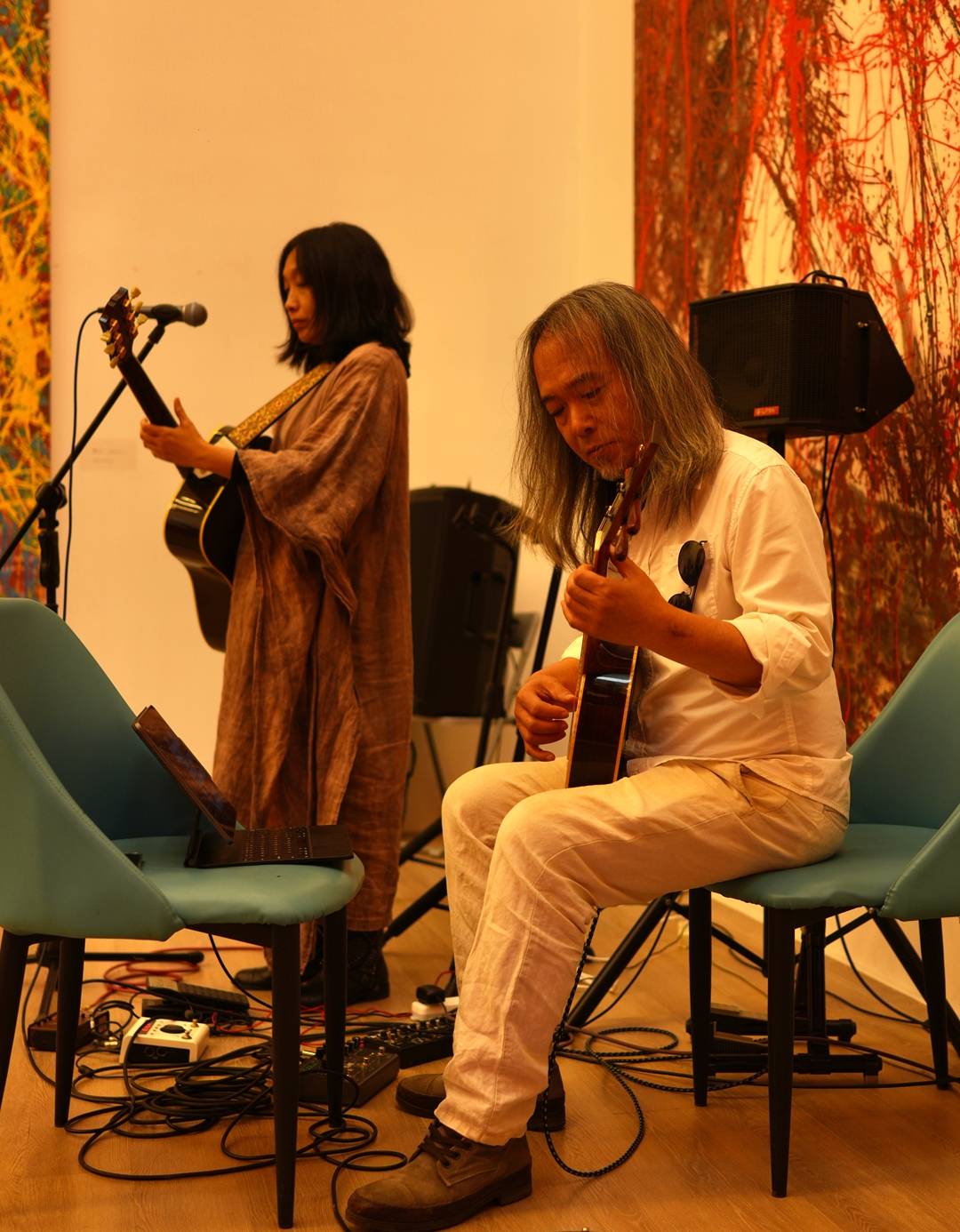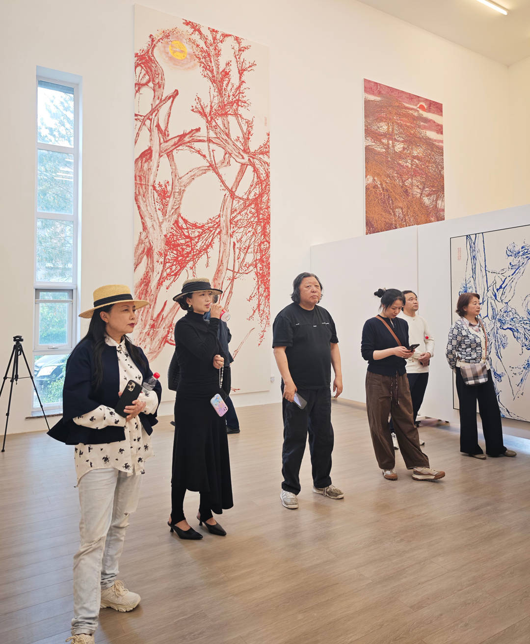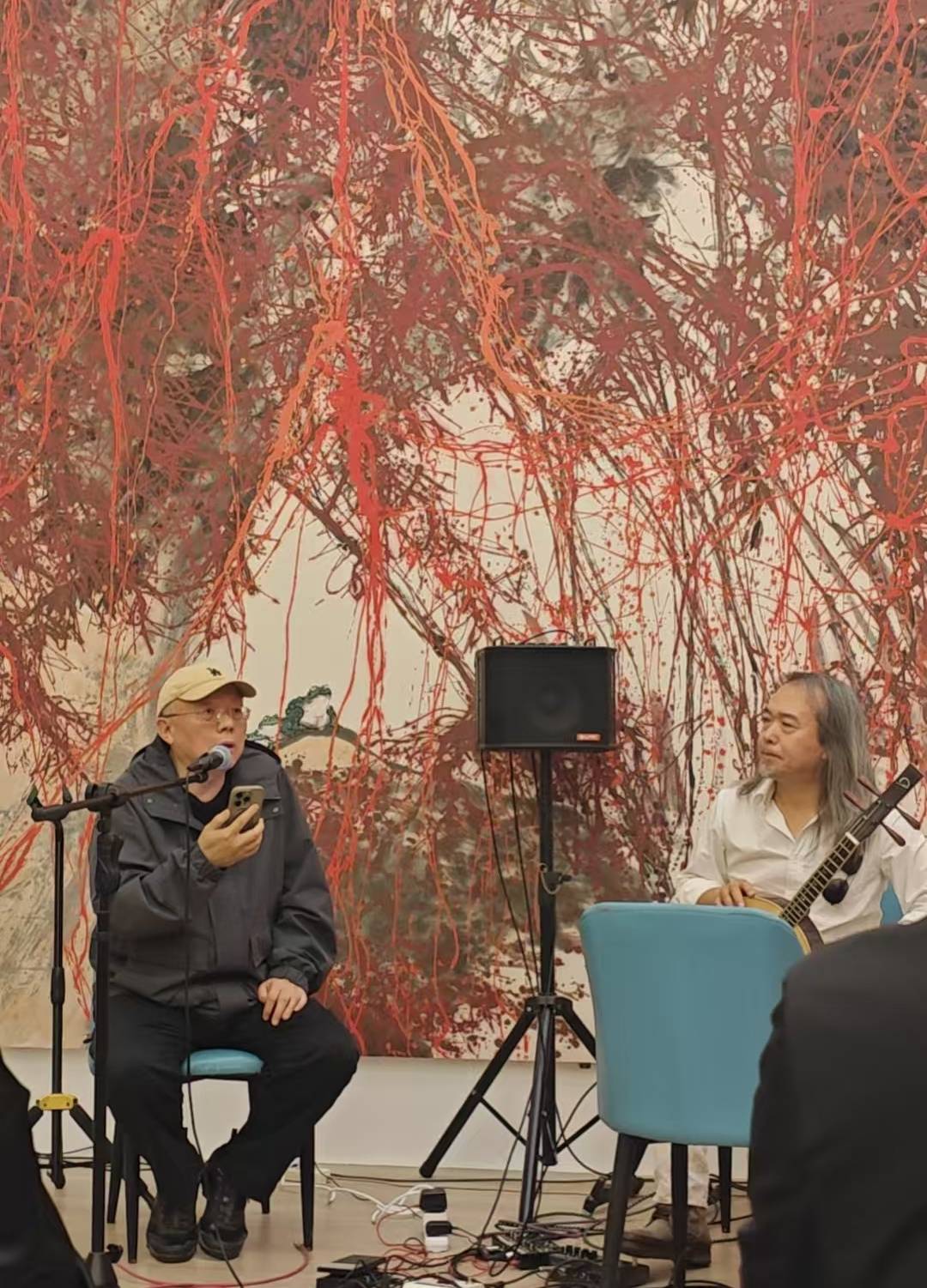 音乐与绘画的对话将现场情绪推向高潮。音乐人李兵、王娟、冬子、李萌能、林夕子携原创音乐作品登场。最动人的是王娟与李兵的即兴演奏演唱《惊红灌顶》,旋律在展厅的银朱色块间缭绕,歌声与红松、赤蕉的画面撞击出巨大的心灵回音。