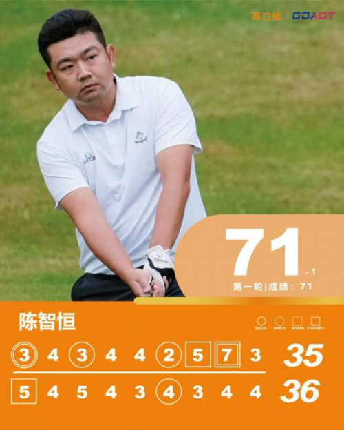 陈智恒首轮从8号洞出发,开局遭遇双柏忌波折,转场后10号洞再吞柏忌,起步颇为艰难。触底之后他迅速调整状态,自15号洞抓鸟开启反击,回到前九洞更是火力全开,1号洞精彩擒鹰,3号洞再添小鸟,一度以单独领跑之势占据榜首。收官阶段他在6号洞再度抓鸟巩固优势,尽管收官洞遗憾吞柏忌掉杆,但仍以71杆(-1)强势锁定并列第一。