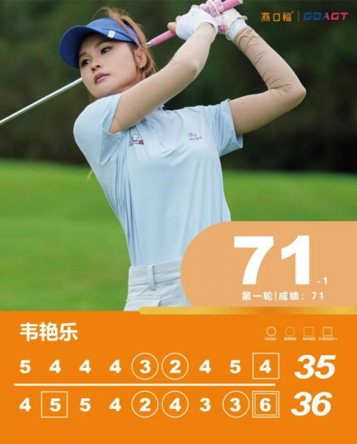 巾帼女将韦艳乐同样上演逆风翻盘好戏。她从7号洞出发,9号、11号洞接连遭遇柏忌,14号洞起迎来爆发,四洞狂抓三只小鸟,一度占据单独领先。虽在18号洞吞下双柏忌短暂滑落,但回到前九洞后她稳扎稳打再无柏忌,5、6号洞连抓小鸟实现强势反超,最终同样交出71杆(-1),与陈智恒并列领跑,同时稳居女子组首位。