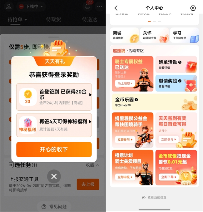 ●抢单不卡顿,好单不错过:首页聚合了“待抢单、待取货、待送达”三大核心场景,界面清爽,操作响应极快。依托鸿蒙系统的优化,即便在午高峰网络拥堵时,也能保持自动接单与智能派单的稳定性,确保你不错过优质订单。