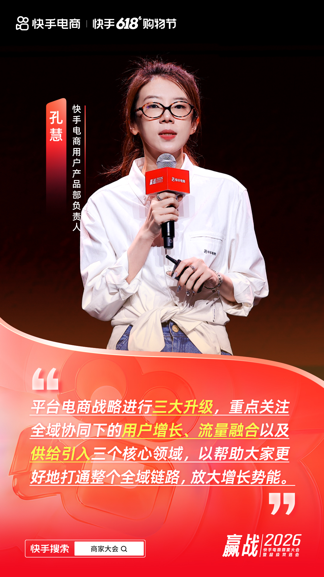 2026年,快手电商将对平台电商战略进行三大升级,重点关注全域协同下的用户增长、流量融合以及供给引入三个核心领域,帮助商家打通全域链路、放大增长势能。